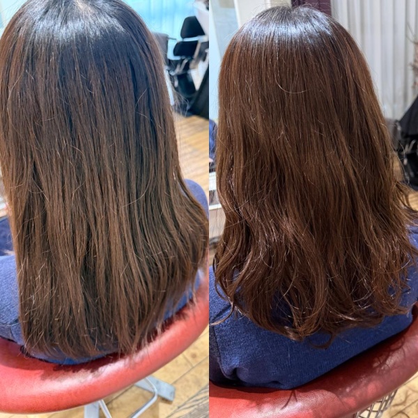 ストレートだと動きが出にくく、コテで巻いてもすぐ取れてしまう状態でしたので、柔らかく動きが出るようにデジタルパーマをさせていただきました。